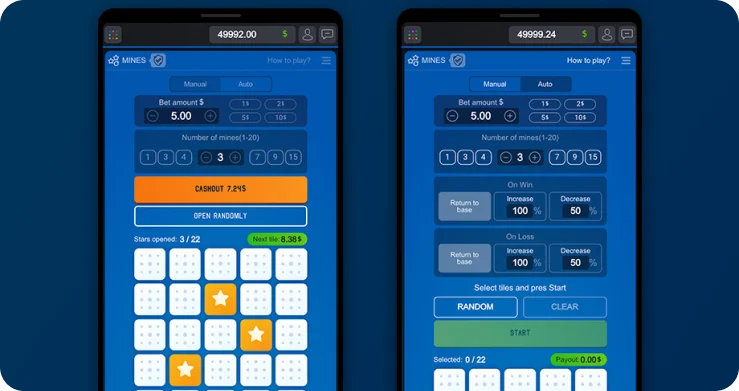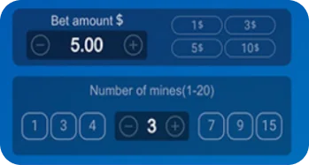 Setzen Sie Ihren Einsatz und wählen Sie die Anzahl der Minen auf dem Spielfeld. Je mehr Minen, desto höher Ihr Gewinn!